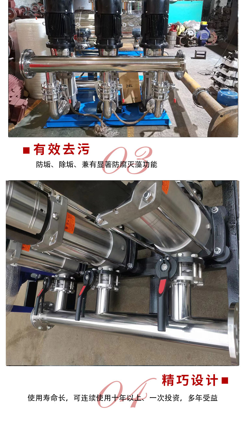 變頻恒壓供水系統(tǒng)以管網(wǎng)水壓(或用戶用水流量)為設(shè)定參數(shù),通過微機(jī)控制變頻器的輸出頻率從而自動(dòng)調(diào)節(jié)水泵電機(jī)的轉(zhuǎn)速,實(shí)現(xiàn)管網(wǎng)水壓的閉環(huán)調(diào)節(jié)(PID),使供水系統(tǒng)自動(dòng)恒穩(wěn)于設(shè)定的壓力值:即用水量增加時(shí),頻率升高,水泵轉(zhuǎn)速加快,供水量相應(yīng)增大;用水量減少時(shí),頻率降低,水泵轉(zhuǎn)速減慢,供水量亦相應(yīng)減小,這樣就保證了供水效率用戶對(duì)水壓和水量的要求,同時(shí)達(dá)到了提高供水品質(zhì)和供水效率的目的,“用多少水,供多少水”;采用該設(shè)備不需建造高位水箱,水塔,水質(zhì)無二次污染,是一種理想的現(xiàn)代化建筑供水設(shè)備。